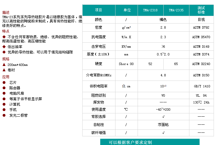 天脈 TMA-23系列導(dǎo)熱硅膠片具有傳熱性能好,絕緣良好的特點(diǎn)。 |