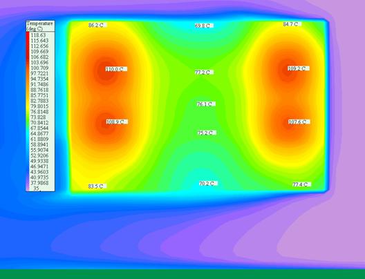 上圖是整流橋殼體正面表面的溫度分布。從上圖可以看出,整流橋殼體正面的溫度分布是極不均勻的,在熱源(二極管)的正上方其表面溫度達(dá)到109 ℃,然而在整流橋的中間位置,遠(yuǎn)離熱源處卻只有75 ℃,其表面的溫差可達(dá)到34℃左右。這主要是由于覆蓋在二極管表面的是導(dǎo)熱性能較差的FR4(其導(dǎo)熱系數(shù)小于3.0W/m.℃),因此它對(duì)整流橋殼體正表面上的溫度均勻化效果很差。同時(shí),這也驗(yàn)證了為什么我們?cè)诓捎谜鳂驓んw正表面溫度作為計(jì)算的殼溫時(shí),對(duì)測(cè)溫?zé)犭娕嘉恢玫姆胖貌煌?,得到的結(jié)果其離散性很差這一原因。