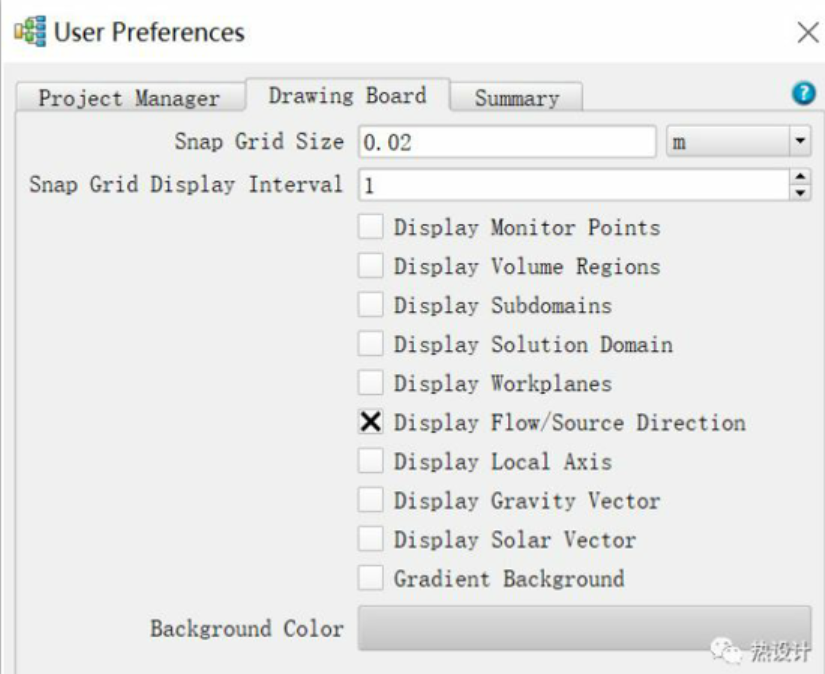 其實Flotherm 中箭頭的指向表示熱源平均分布在指向的最近一層網(wǎng)格中,我們來設(shè)計一個小仿真驗證一下。首先我們看一下如何在FLOTHERM中打開source箭頭方向。