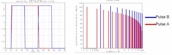 脈沖A,圖中紅線(xiàn)所示,時(shí)鐘頻率為20MHz,上升沿下降沿時(shí)間為1nS。脈沖B,圖中藍(lán)線(xiàn)所示,時(shí)鐘頻率為40MHz,上升沿下降沿時(shí)間為0.5nS。Pulse A, the red trace, has a 20MHz clock and 1nS rise/fall time. Pulse B, the blue trace, has a