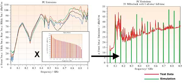 在圖4中,模擬時(shí)寬帶頻譜被時(shí)鐘頻譜加倍。將試驗(yàn)結(jié)果與在無(wú)回波響應(yīng)腔中取得的測(cè)試數(shù)據(jù)進(jìn)行對(duì)比。盡管復(fù)位線(xiàn)沒(méi)有采取屏蔽措施,輻射仍在FCC的B類(lèi)限制范圍之內(nèi)(由216兆赫至960兆赫的允許最多衰減量為46dBuV/m)。由于在模型中沿縫處沒(méi)有電接觸,因此模擬時(shí)輻射可能擴(kuò)大到700兆赫以上。