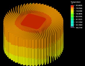 Icepak軟件提供薄板散熱模型,用戶只需要給出薄板的有效厚度,在薄板的厚度方向不做網(wǎng)格,而實(shí)際厚度的體現(xiàn)由求解器來完成。從而大大減少了模型規(guī)模,提高了工作效率。薄板散熱模型是Icepak軟件的獨(dú)特功能。下邊兩幅圖為Icepak軟件進(jìn)行散熱器分析得到的溫度分布結(jié)果,其中左圖是復(fù)雜幾何形狀的散熱器,右邊模型的建立采用了無厚度導(dǎo)熱板。