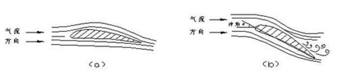 散熱風(fēng)機(jī)的葉輪結(jié)構(gòu)、尺寸都是按照額定的風(fēng)量設(shè)計(jì)的,當(dāng)散熱風(fēng)機(jī)在正常的風(fēng)量工作時(shí),氣體進(jìn)入葉輪的方向與葉片風(fēng)量進(jìn)口安裝角基本一致,氣體平穩(wěn)地流過(guò)葉片(如下圖a)。當(dāng)進(jìn)入葉輪的氣體流量小于額定流量時(shí),氣流與葉片進(jìn)口形成正沖角,即α>0,且此正沖角超過(guò)某一臨界值時(shí),葉片背面流動(dòng)工況開(kāi)始惡化,邊界層受到破壞,在葉片背面尾端出現(xiàn)渦流區(qū),即所謂“失速”現(xiàn)象,如圖1(b)所示。沖角大于臨界值越多,失速現(xiàn)象越嚴(yán)重,流體的流動(dòng)阻力越大,使葉道阻塞,同時(shí)風(fēng)機(jī)風(fēng)壓也隨之迅速降低。