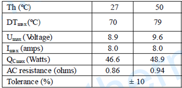 DTmax:當熱電冷卻器通過最大電流,同時,熱電冷卻器加載的熱量為零時,熱電冷卻器兩端所達到的最大溫差。