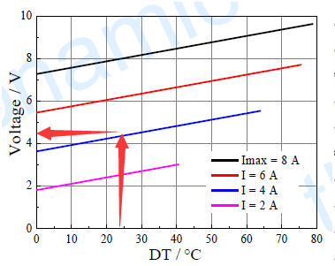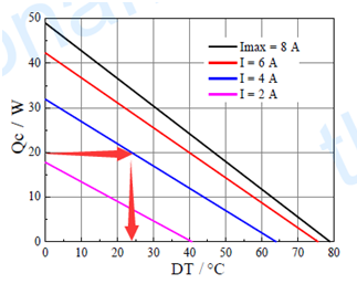 芯片溫度控制在26℃,則溫升要求為24℃。通過規(guī)格書中的制冷量、電流、溫差圖,獲知工作電流應為4A