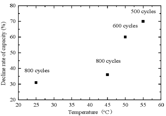圖1 典型電池不同溫度、不同循環(huán)次數(shù)下容量衰減程度實(shí)驗(yàn)結(jié)果
