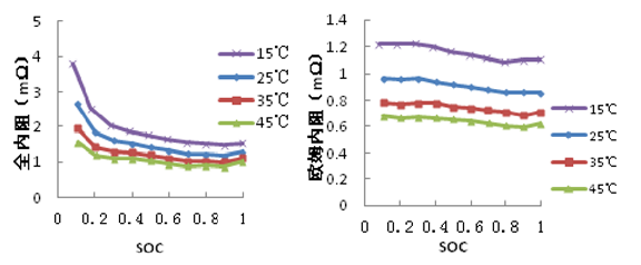 圖2 中航鋰電70A.h磷酸鐵鋰動力電池全內(nèi)阻和歐姆內(nèi)阻隨溫度、SOC的變化曲線測試值