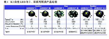 近年來,大功率LED發(fā)展較快,在結(jié)構(gòu)和性能上都有較大的改進,產(chǎn)量上升、價格下降;還開發(fā)出單顆功率為100W的超大功率白光LED。與前幾年相比較,在發(fā)光效率上有長足的進步。例如,Edison公司前幾年的20W白光LED,其光通量為700lm,發(fā)光效率為35lm/W。2007年開發(fā)的100W白光LED,其光通量為6000lm,發(fā)光效率為60lm/W。又例如,Lumiled公司最近開發(fā)的K2白光LED,與其Ⅰ、Ⅲ系列同類產(chǎn)品比較如表1所示。從表中可以看出:K2白光LED在光通量、最大結(jié)溫、熱阻及外廓尺寸上都有較大的改進。Cree公司新推出的XLamp XR~E冷白光LED,其最高亮度擋QS在350mA時光通量可達107~114lm。這些性能良好的大功率LED給開發(fā)LED白光照明燈具創(chuàng)造了條件。