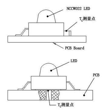 采用一定散熱面積的PCB、裝上LED的試驗板,在LED工作狀態(tài)下測出TC再計算的方法來作散熱設計是一種簡便、有效的方法,可以較好地設計出滿足結溫TJmax要求的散熱結構(PCB材質及面積)。