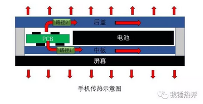 如下圖所示,手機主要發(fā)熱源是主板PCB(上面的器件),其熱量傳導在內部有兩條路徑。