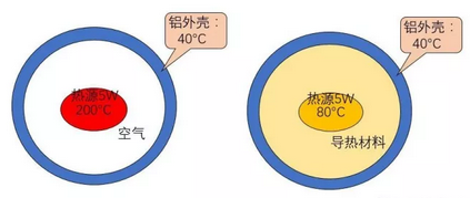 從圖二的結論可以看出,即使把熱源和殼體很好的隔熱(左圖中用空氣隔熱),外殼的平均溫度不會變化,依然是40°C,而內部熱源溫度會增加(在這個假設的場景中,熱源溫度由80°C增加至200°C)。這個結論也可以用熱阻、溫差的公式得出。
