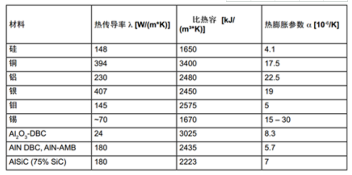 表1是和模塊相關(guān)的一些材料的熱特性參數(shù)。對于傳統(tǒng)的模塊,一般芯片的材料為硅,陶瓷基板(DBC)的材料為Al2O3或ALN,底板的材料為銅,散熱器的材料為鋁。
