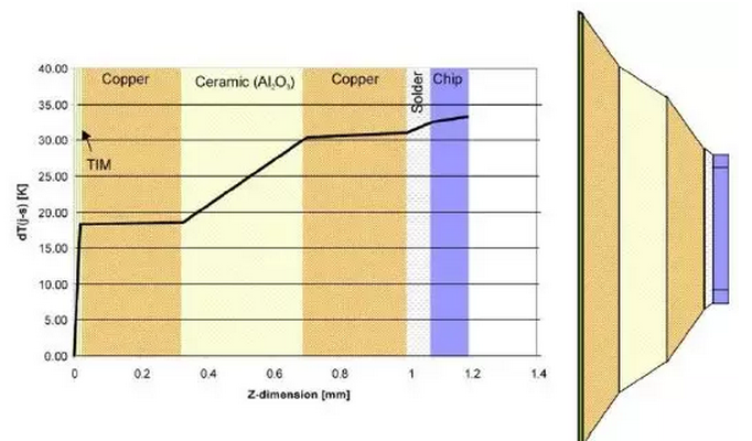 圖3顯示了一個無底板模塊在沒有其他熱干擾的情況下,不同散熱分層的溫度傳導分布,這里我們可以看到每層的熱傳導和熱流過的面積。在一維模型中,較薄的銅層會取得較小的熱阻,但在真實的三維模型中,我們會看到熱擴散能力較弱,熱阻Rth反而會加大。有較厚金屬層的DCB基板對熱擴散有好處,但它增加了基板本身的熱應(yīng)力。