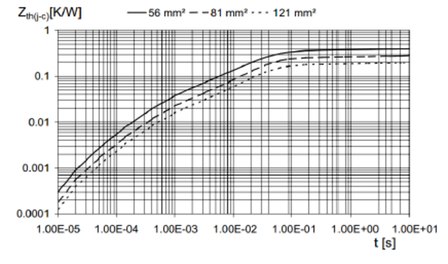 我們通過等效電路(圖9)來反應(yīng)動態(tài)傳熱特性的熱阻抗。在數(shù)據(jù)文件中一般會給出熱阻抗Zth關(guān)于參數(shù)Ri和τi((時間常數(shù))的幾組數(shù)據(jù),用來計算Zth關(guān)于時間的函數(shù)關(guān)系。τi = Rthi*Cthi,有些數(shù)據(jù)書會直接給出算好的曲線圖,如圖10所示。