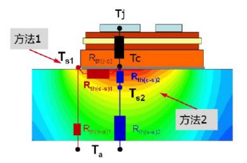 實際應(yīng)用中模塊內(nèi)部可能是由多芯片并聯(lián)組成,每個芯片對應(yīng)點的溫度都會有差異,因此我們一般會采用多點測量取平均值的方式定義Tc和Ts(方法2),如圖6所示。