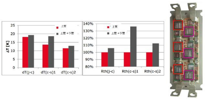 下面我們用一個實際測試的案例來量化熱耦合的影響程度,圖8是基于單橋臂IGBT模塊的測試結(jié)果,紅色方框所示為上管,紫色框內(nèi)所示為下管。我們可以看出上下管同時工作的溫差要比單個上管工作的溫度最大高出10度。以殼到散熱器為例,單個上管工作的溫差為18度,如上下管同時導通溫差達到近28度,熱阻值高出原有值35%之多。