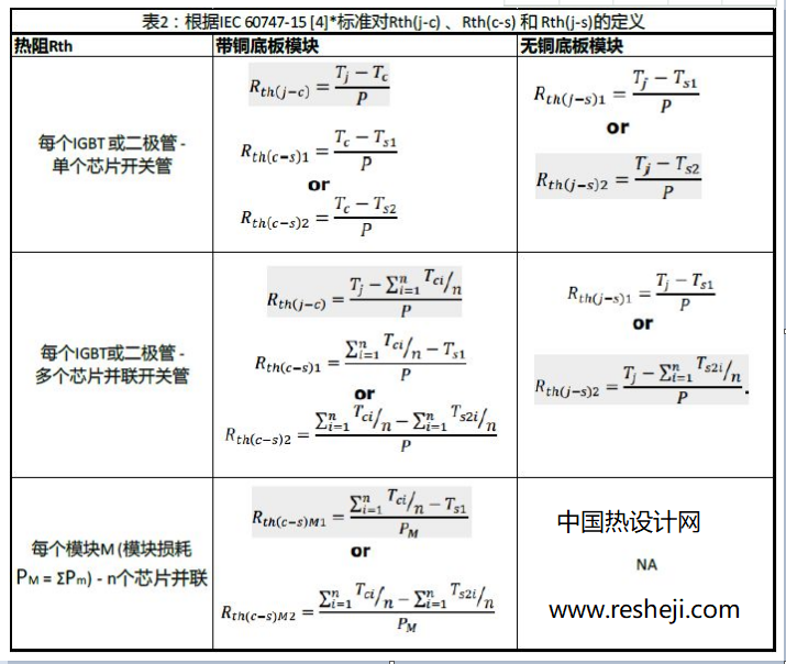 通過上面的測量和定義方式我們便可以根據(jù)損耗計算出模塊的實際熱阻值,Rth(j-c) (結(jié)到殼的熱阻)、Rth(c-s) (殼到散熱器的熱阻) 和Rth(j-s) (結(jié)到散熱器的熱阻)。表2根據(jù)IEC60747-15 [4]*的標準對各熱阻做了非常清晰的定義: