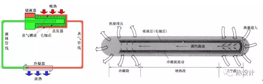 圖16-2 環(huán)路熱管(左)和傳統(tǒng)熱管(右)的工作原理示意圖