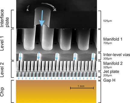 圖10. 噴射沖擊冷卻系統(tǒng)和需要散熱的芯片 (這個(gè)散熱系統(tǒng)安置在一個(gè)幾克重的純銅散熱片上。)