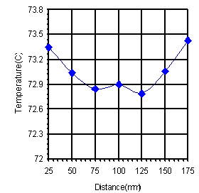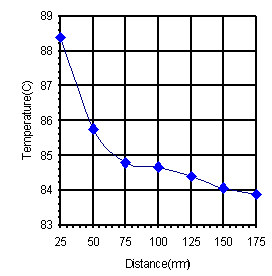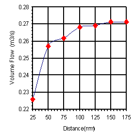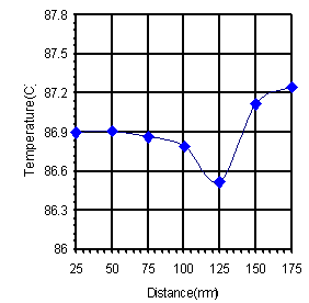 由圖2可以看出,在該模塊中,流經(jīng)冷卻風扇流體的體積流量隨著風扇與散熱器間距離的增大而增大,并且該體積流量的增大在Distance為25.0mm~75.0mm之間尤為顯著,也即是說:此時冷卻風扇的流量對該距離非常敏感,把該距離稍微增大一點,流體流經(jīng)風扇的體積流量就有相當顯著的變化。同時,當Distance的取值為75.0mm~175.0mm之間時,雖然從總體上而言風扇的體積流量也隨距離的增大而增加,但其增大的幅度較前一階段有明顯的下降,也即是說:此時風扇流量處于對該距離的不太敏感區(qū)域。上述的結論,我們也可以從冷卻風扇工作點的壓力值與距離之間的關系圖(圖2)及各個溫度監(jiān)控點隨距離的變化關系曲線(如圖3、4、5、6等)上可以得到進一步的證明。