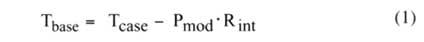 為了選擇合適的散熱器,熱設(shè)計(jì)首先要確定散熱器的最大設(shè)計(jì)熱阻。要得到這一數(shù)值必須知道芯片的最大殼溫,Tcase,芯片的熱功耗,Pmod,以及芯片與散熱器的接觸熱阻,Rint。散熱器底面的最高溫度Tbase,可由以下公式給出: