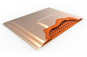 均溫板由內(nèi)壁具有微結(jié)構(gòu)的密封真空容器和少量與其自身氣體平衡的工作流體組成。真空容器通常由銅制成,并圍繞周邊密封。內(nèi)壁的微結(jié)構(gòu)可以由許多不同的物質(zhì)制成。最常見的方法是將銅粉燒結(jié)到容器的內(nèi)壁。許多流體可用作VCH的工作流體。但是,在大多數(shù)CPU,GPU和LED冷卻應(yīng)用中,通常會(huì)選擇水作為工作流體,因?yàn)樗臐摕岣?,表面張力高,熱?dǎo)率高,且基于成本和環(huán)境方面的考慮等。
