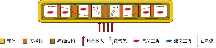 早期應用的VC是最經(jīng)典的純金屬支撐柱式,支撐柱僅發(fā)揮結構加強的作用。之后演變出在支撐柱外套一層粉末燒結毛細環(huán),或直接將金屬柱換成毛細粉柱,采用純毛細柱排列或金屬柱與毛細柱混合排列。這樣在冷面凝結的工質(zhì)可以通過毛細環(huán)或毛細柱向熱面蒸發(fā)區(qū)回流,回流路徑大大縮短,補液速率增大,VC傳熱能力因此增強。