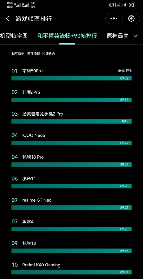 在報告中,分別使用三款目前主流的游戲進行測試,包括和平精英、王者榮耀、以及原神。對絕大部分手機而言,和平精英,王者榮耀幀率的上限值為90幀,也就是所謂的“滿幀”,而目前可以做到滿幀運行的機型,幾乎都采用的是新款旗艦級處理器,包括榮耀50系列中搭載的驍龍778G。