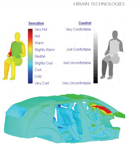 利用人體熱舒適性模塊的Fiala 人體調(diào)節(jié)模型,可以考慮身高、體重、性別、活動(dòng)級(jí)別及自身調(diào)節(jié),模擬人體生熱,分析人體熱舒適度的變化,用于模擬汽車經(jīng)過(guò)暴曬后空調(diào)的制冷評(píng)估等,利用人體熱舒適度指標(biāo)直觀評(píng)價(jià)空調(diào)的溫控能力。